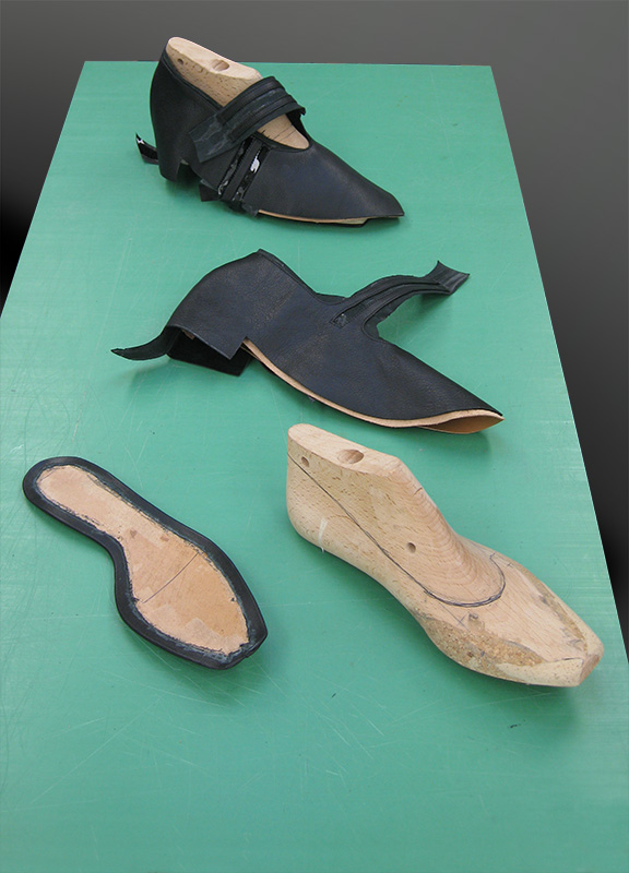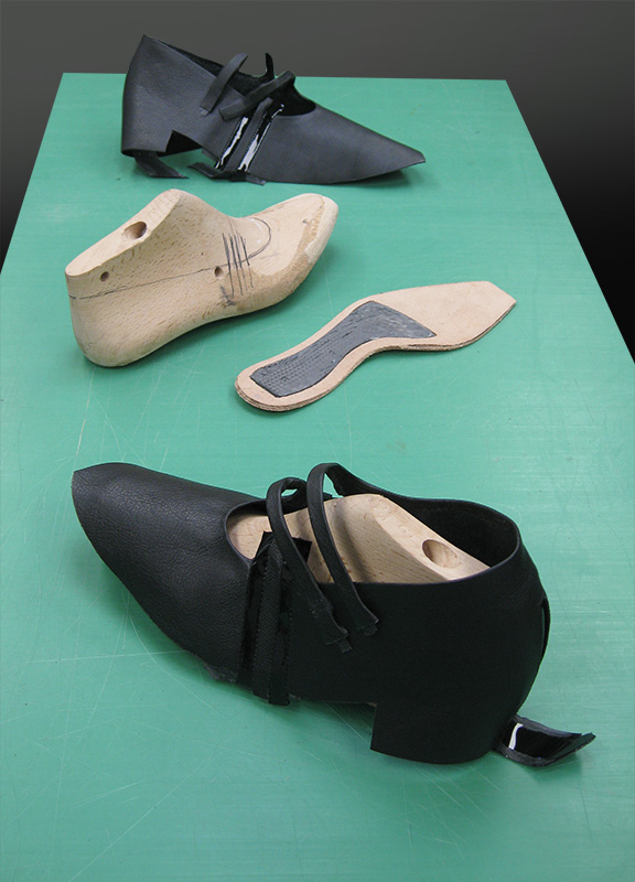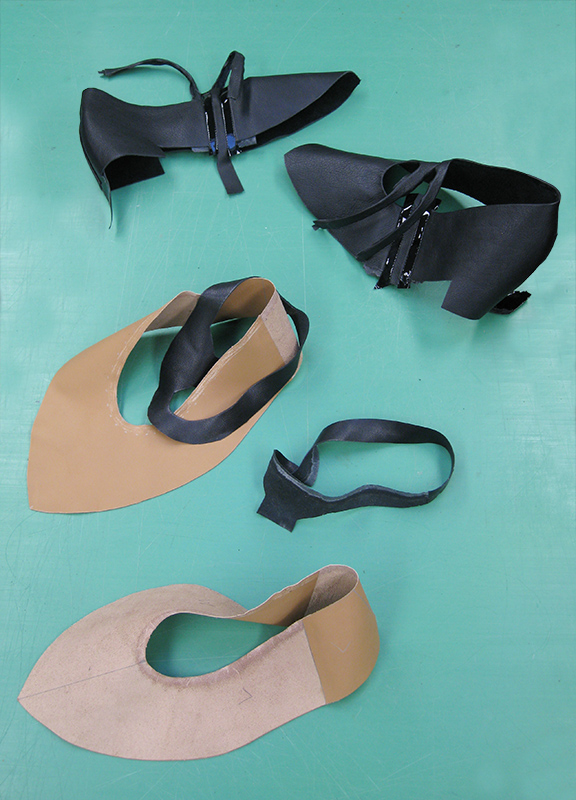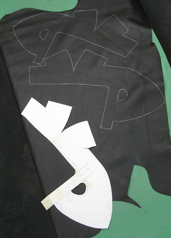 Dat bracht een nieuwe uitdaging met zich mee. Een schoen wordt immers uit een platte leren huid gesneden, en het bandje als vast onderdeel van het patroon opnemen is eigenlijk niet mogelijk. Het patroon heeft de vorm van een breed hoefijzer, terwijl het bandje daar dwars doorheen loopt. En precies dat is hier wél gedaan.